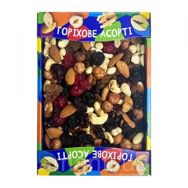 Склад: фундук, мигдаль, кеш'ю, родзинки: золоті та темні, вишня в'ялена, клюква в'ялена.